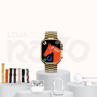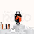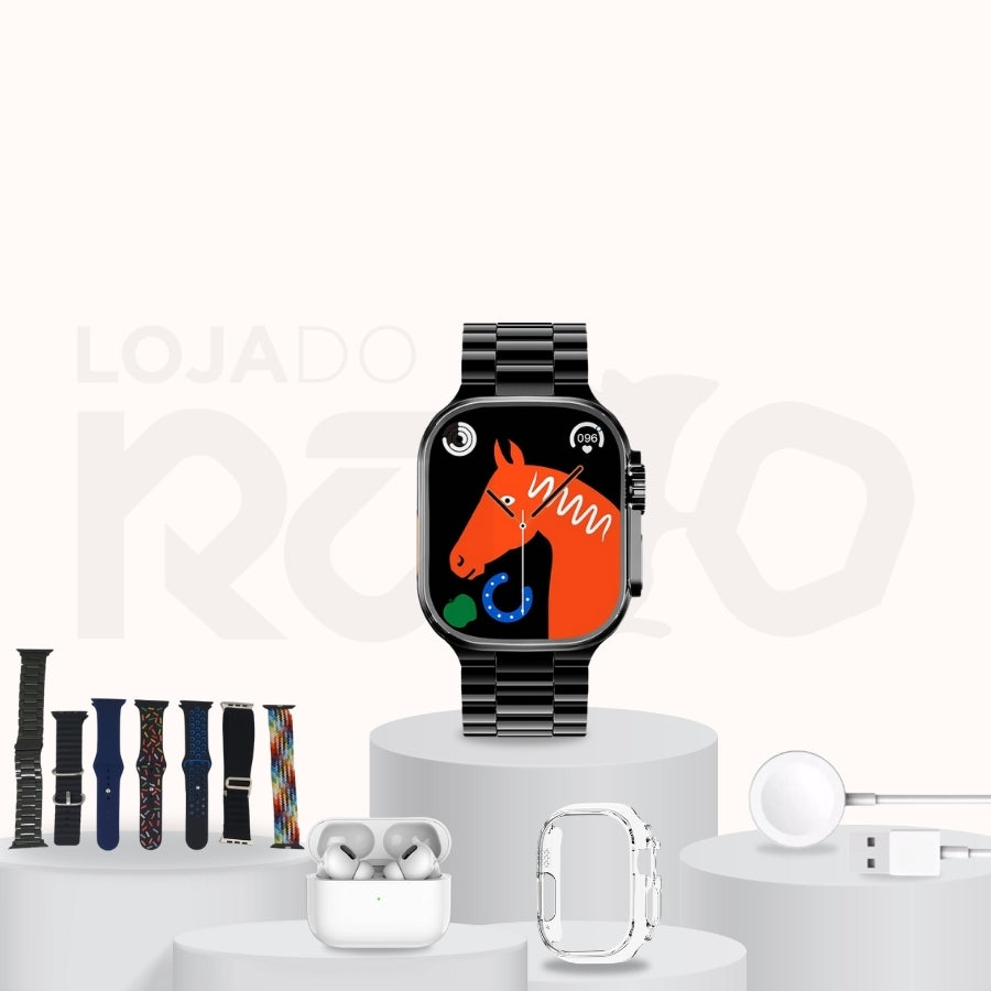 Um conjunto muito completo, vem com 7 braceletes diferentes, uns airpods pro e ainda um capa protetora para o smartwatch.