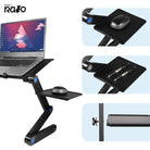 O Suporte Portátil Multifuncional vem com um suporte anexável / removível para o rato, projetado com ventoinha de resfriamento e funciona com alimentação USB do laptop / banco de energia / adaptador direto.