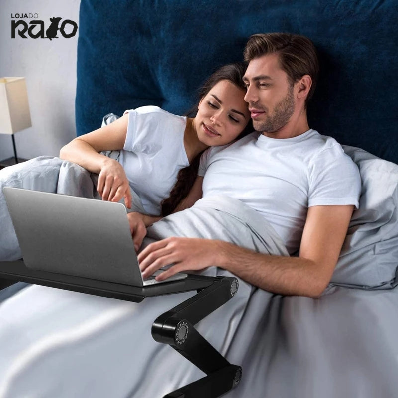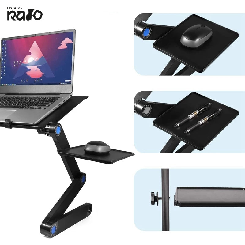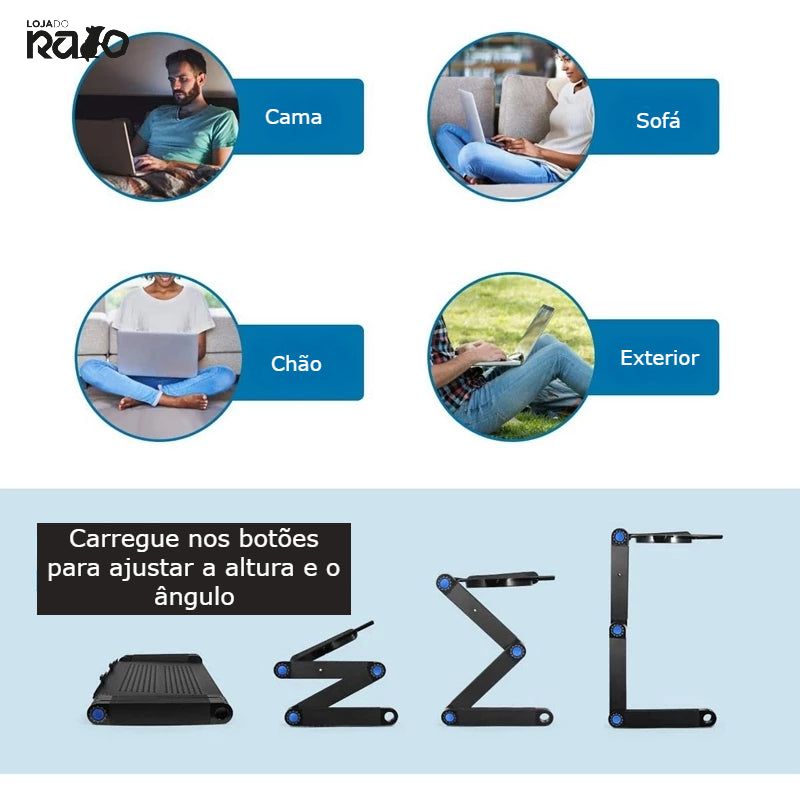 LEVE , BANDEJA DE ALUMÍNIO DE ALTA RESISTÊNCIA, PERNAS RESISTENTES TOTALMENTE AJUSTÁVEIS - Facilita o transporte e mantém o computador firme e estável. Gire 360 graus e trave no lugar em vários ângulos.